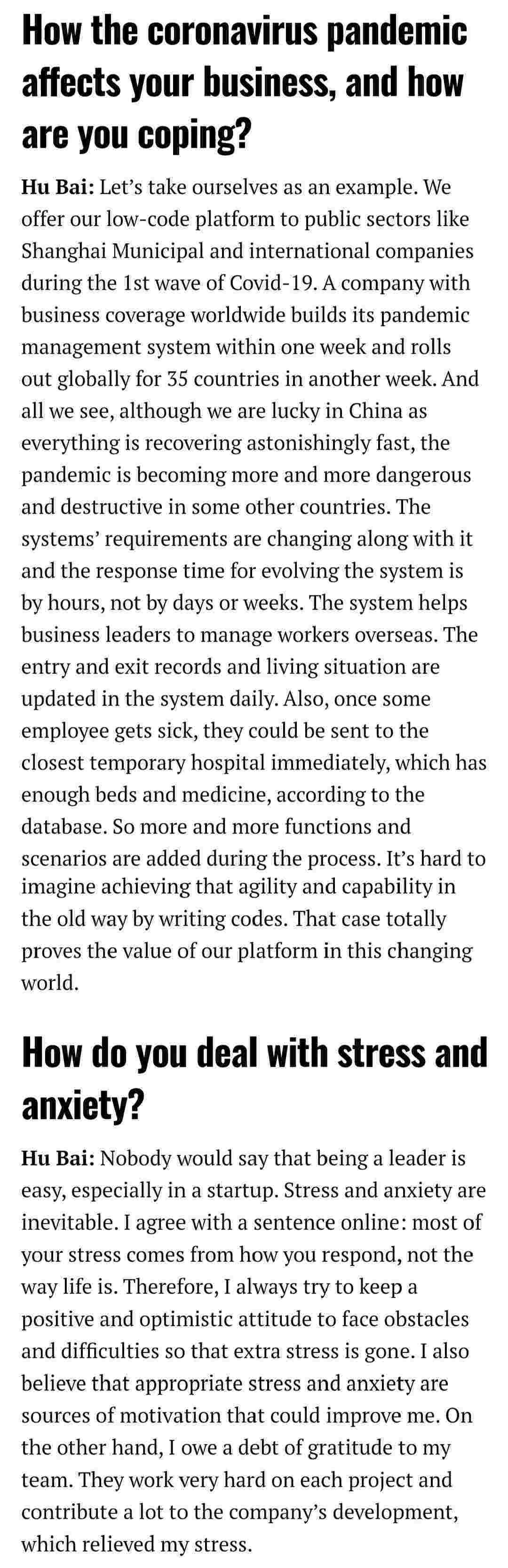 2021年年初,,,,,,,爱湃斯科技CEO胡柏受邀接受法媒Startup.info的专访,,,,,,,,,与Startup info的读者分享了自己的创业经历、、、、、以及低代码平台小米钱包的创新之处。。。。。。。。。。